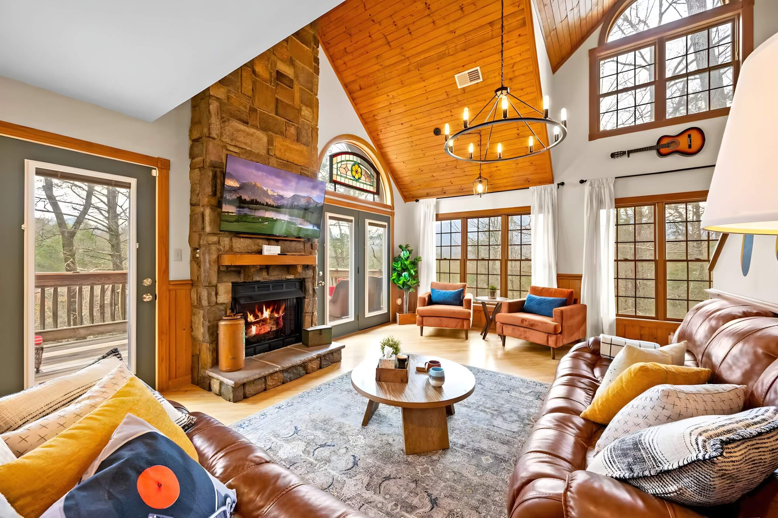 The great room is the perfect spot to chill out after a long day of exploring the beautiful Smoky Mountains area. Curl up on one of the comfy sofas and stream your favorite shows on the flat-screen Smart TV, devour a good book, or simply enjoy each other’s company. This area also has a stone gas fireplace, large windows with stunning views, and access to the main-level deck.